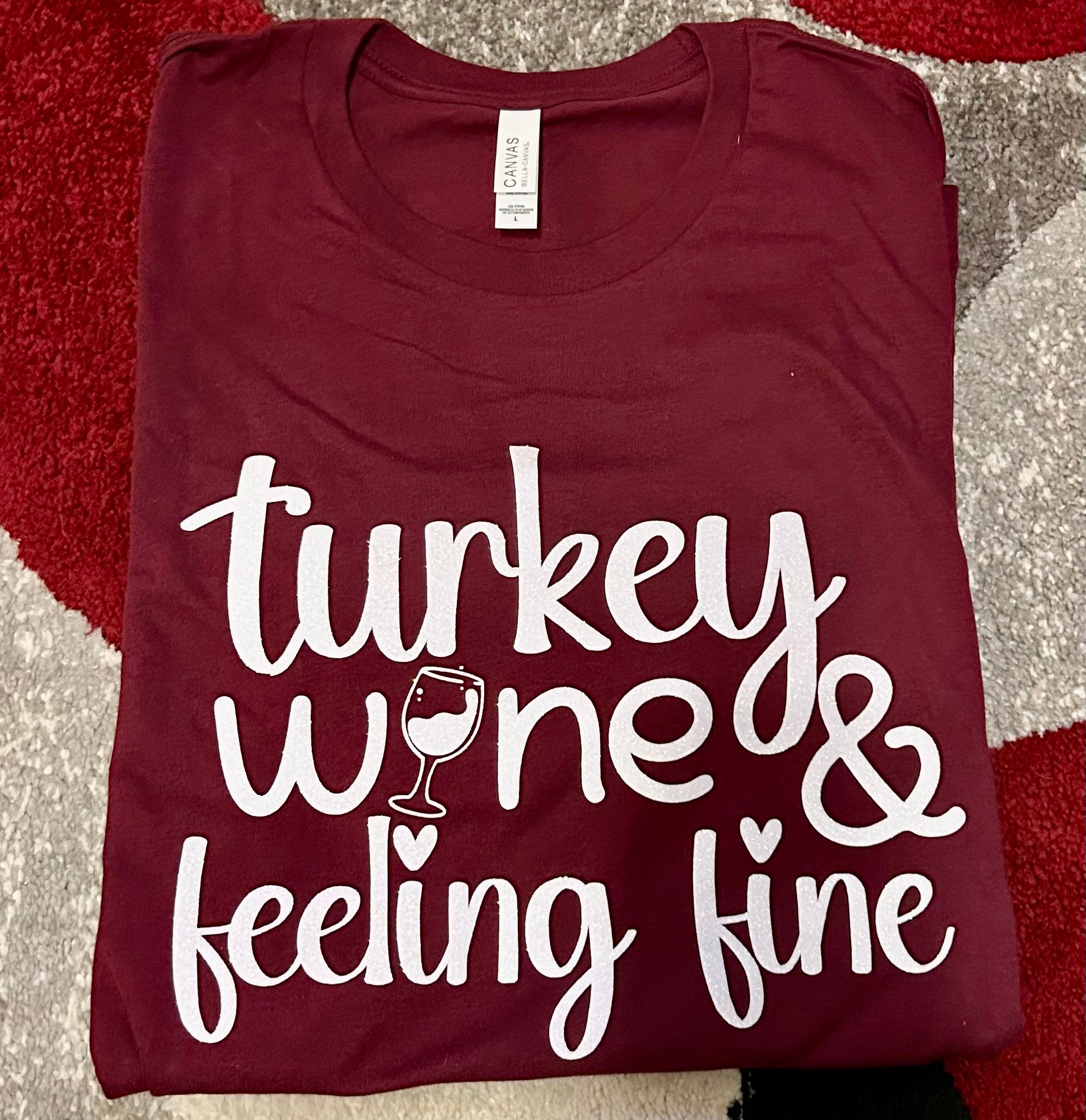 Turkey wine and feeling fine is a great thanksgiving day shirt. This funny shirt is perfect for the season. The vinyl can be sparkle or matte. Colors of the design can be changed.